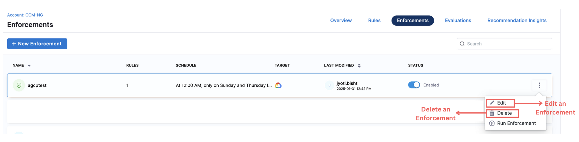 To delete an enforcement, simply click on “Delete” from the vertical ellipsis menu (⋮).