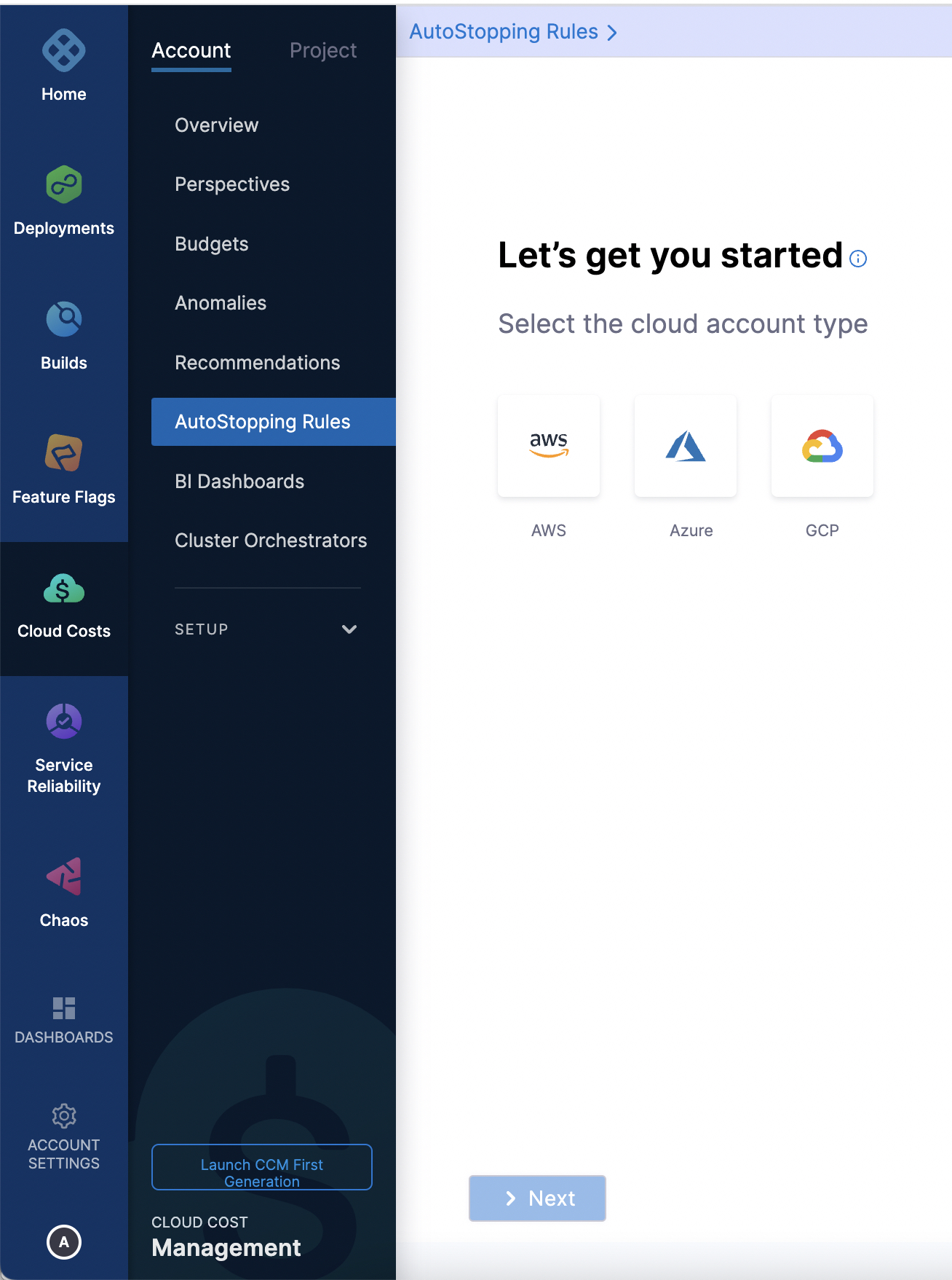- In the cloud account type, select Azure. It is the cloud account in which your workloads are running that you want to manage using AutoStopping rules.