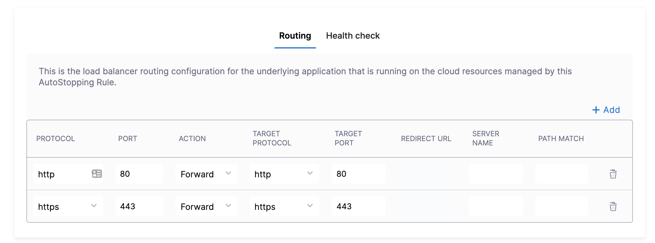 This is the load balancer routing configuration for the underlying application that is running on the cloud resources managed by this AutoStopping rule.