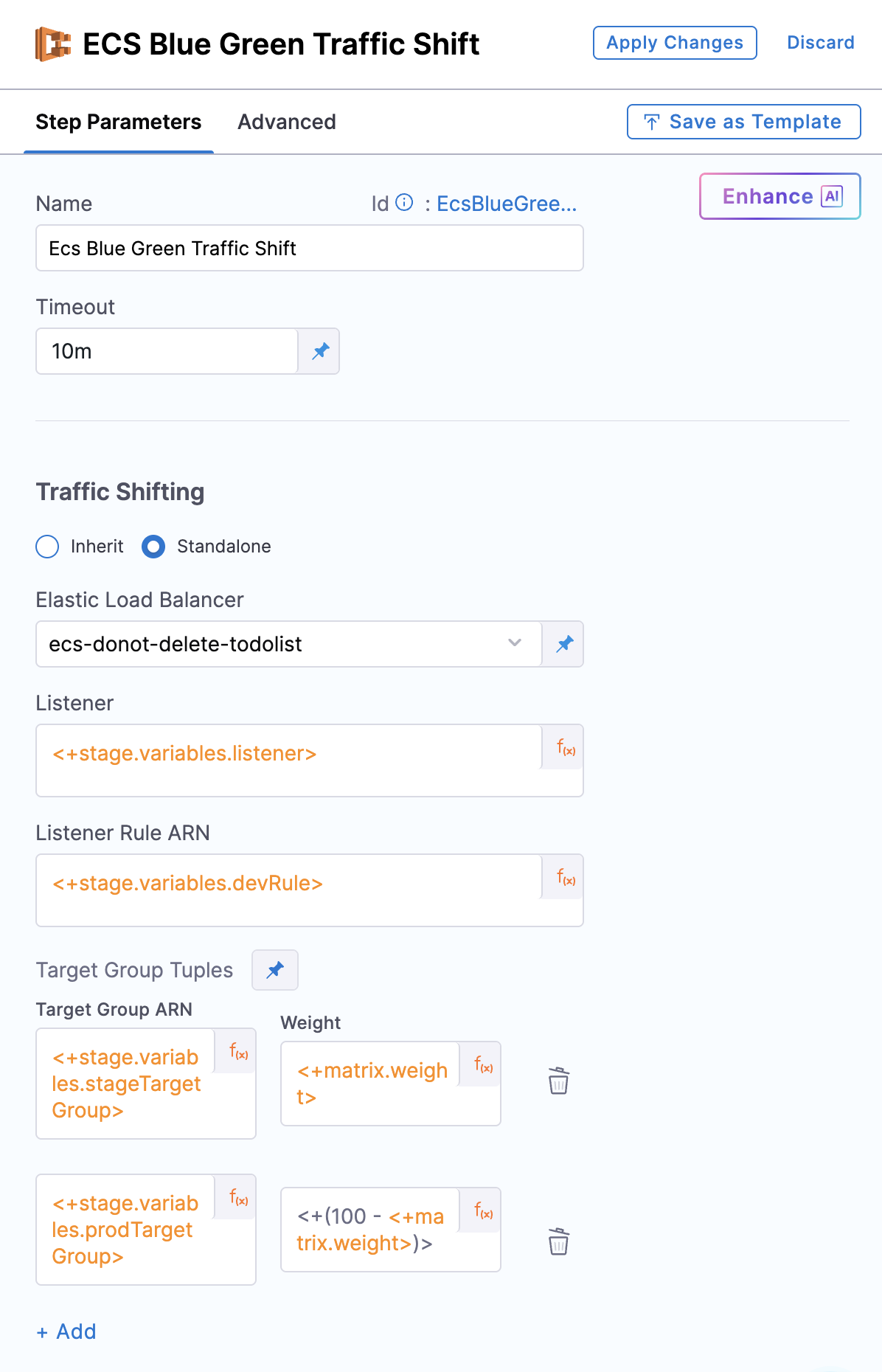 . - Add an ECS Traffic Shift step (inherit or standalone) to begin shifting traffic incrementally.