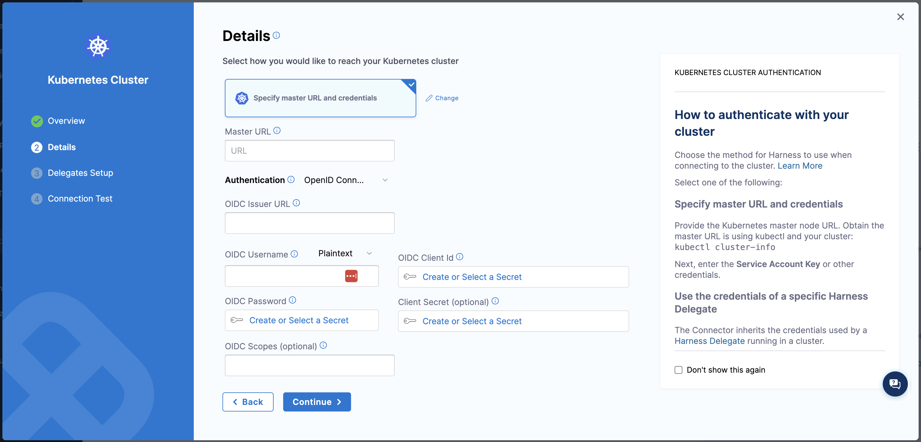 8. In Cluster Details, select or add a Harness Kubernetes Cluster connector.