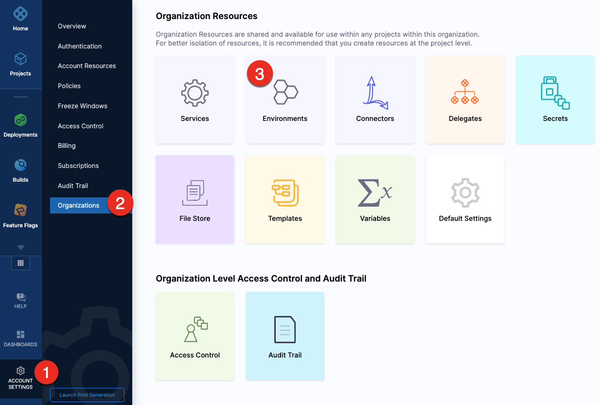 To create an environment at an account or organization level, go to Organization Resources >Environments.