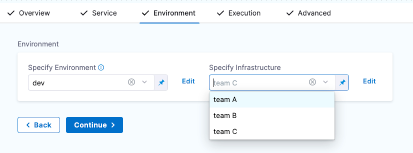 During pipeline execution, all infrastructure definitions are displayed, regardless of whether they are scoped to the selected service.Users are advised to manually ensure that only the appropriate infrastructure definitions are chosen for their services. This limitation is more prominent when services or environments are dynamically expressed, as scoping may not apply consistently.