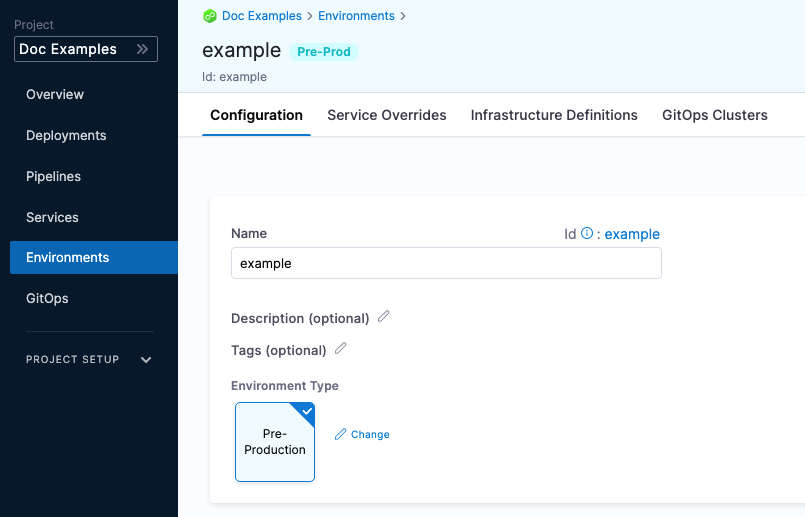 Environments represent your deployment targets (QA, Prod, etc). Each environment contains one or more Infrastructure Definitions that list your target clusters, hosts, namespaces, etc.