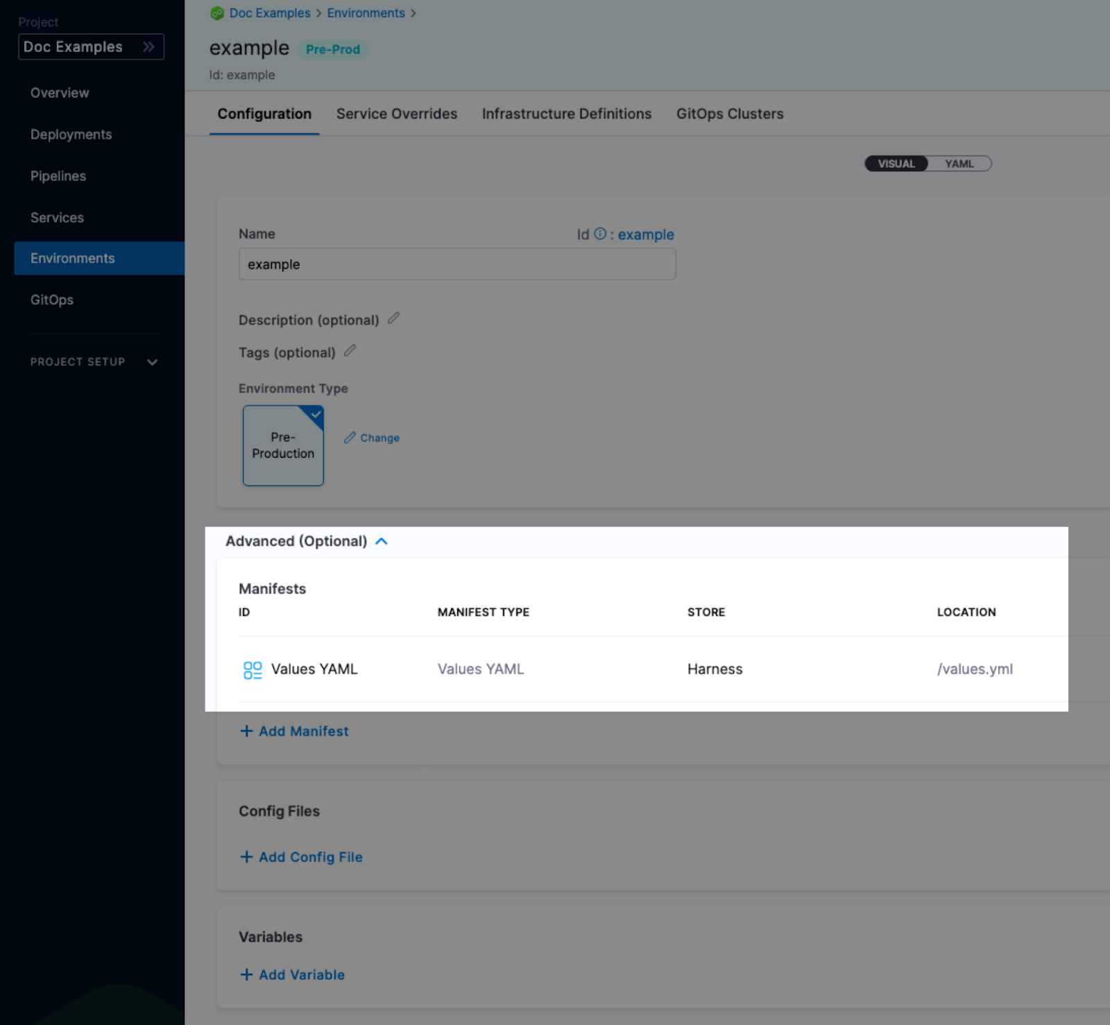 You can also set default manifests, specifications, config files, and variables to use whenever Harness deploys a service to this environment.
