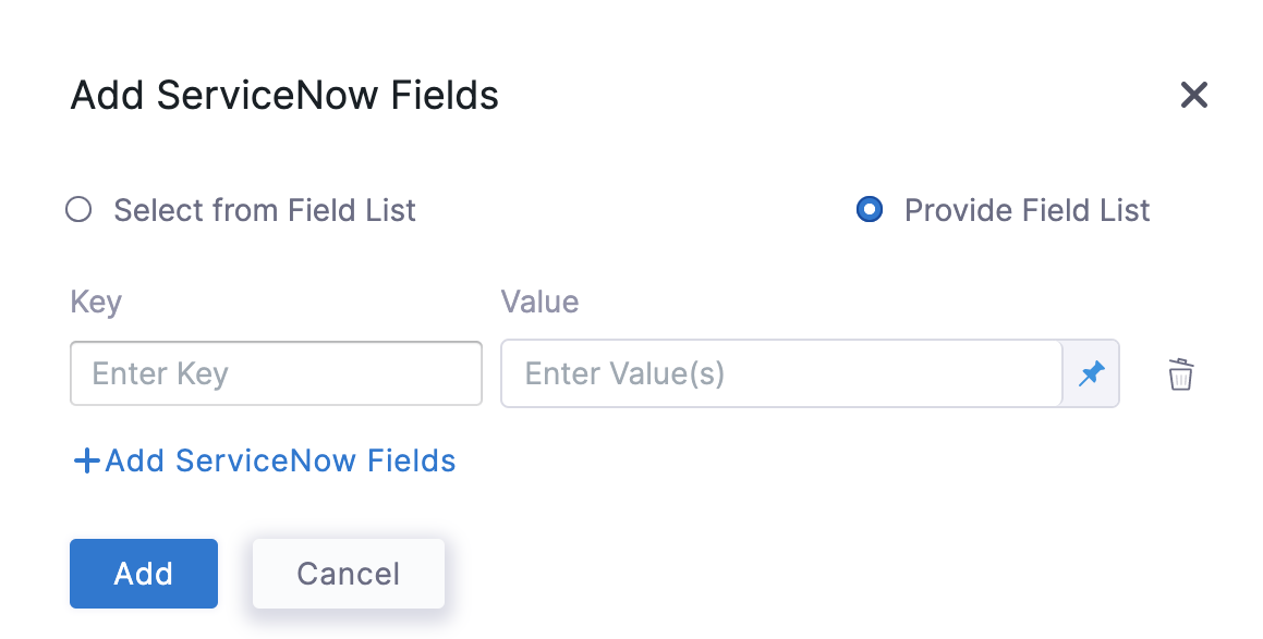 Select Configure Fields to select or add ServiceNow Fields to your ServiceNow ticket. This option enables you to access multiple custom fields from your ServiceNow integration.