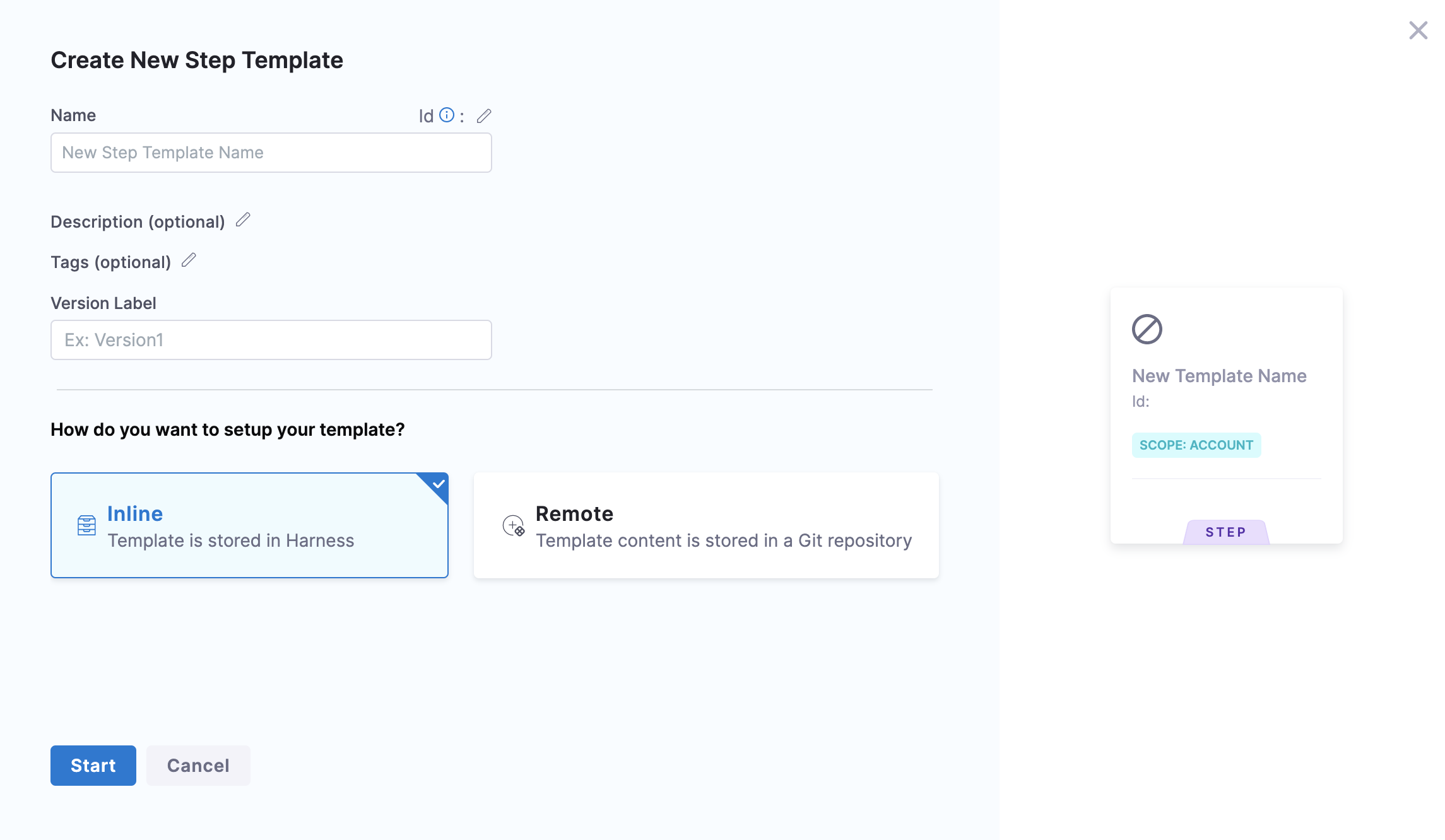 You can create a Template and save it either in Harness or in a Git repository using the Inline or Remote option respectively.
