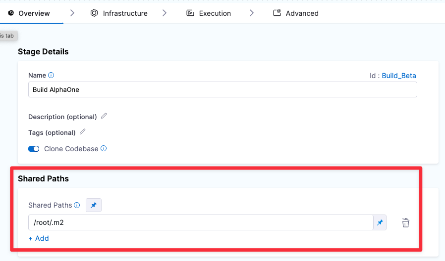 . Any step in the stage can create, retrieve, update, and delete files in this folder. If you need to share additional volumes between steps in the stage, you can add Shared Paths in the Build stage settings. Paths must begin with a forward slash, such as /vol