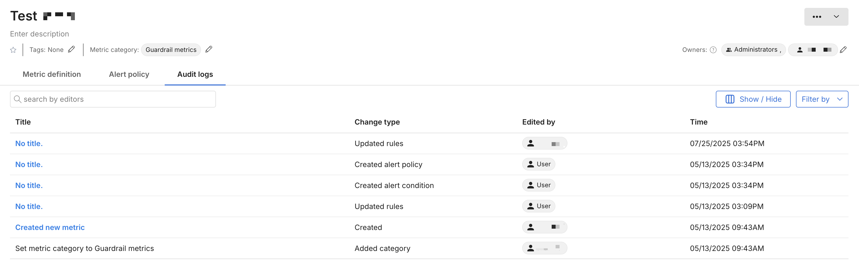 Changes to individual objects within Split such as a feature flag, segment, or metric are logged, regardless of whether the change is made by a user, an API call, or an integration.