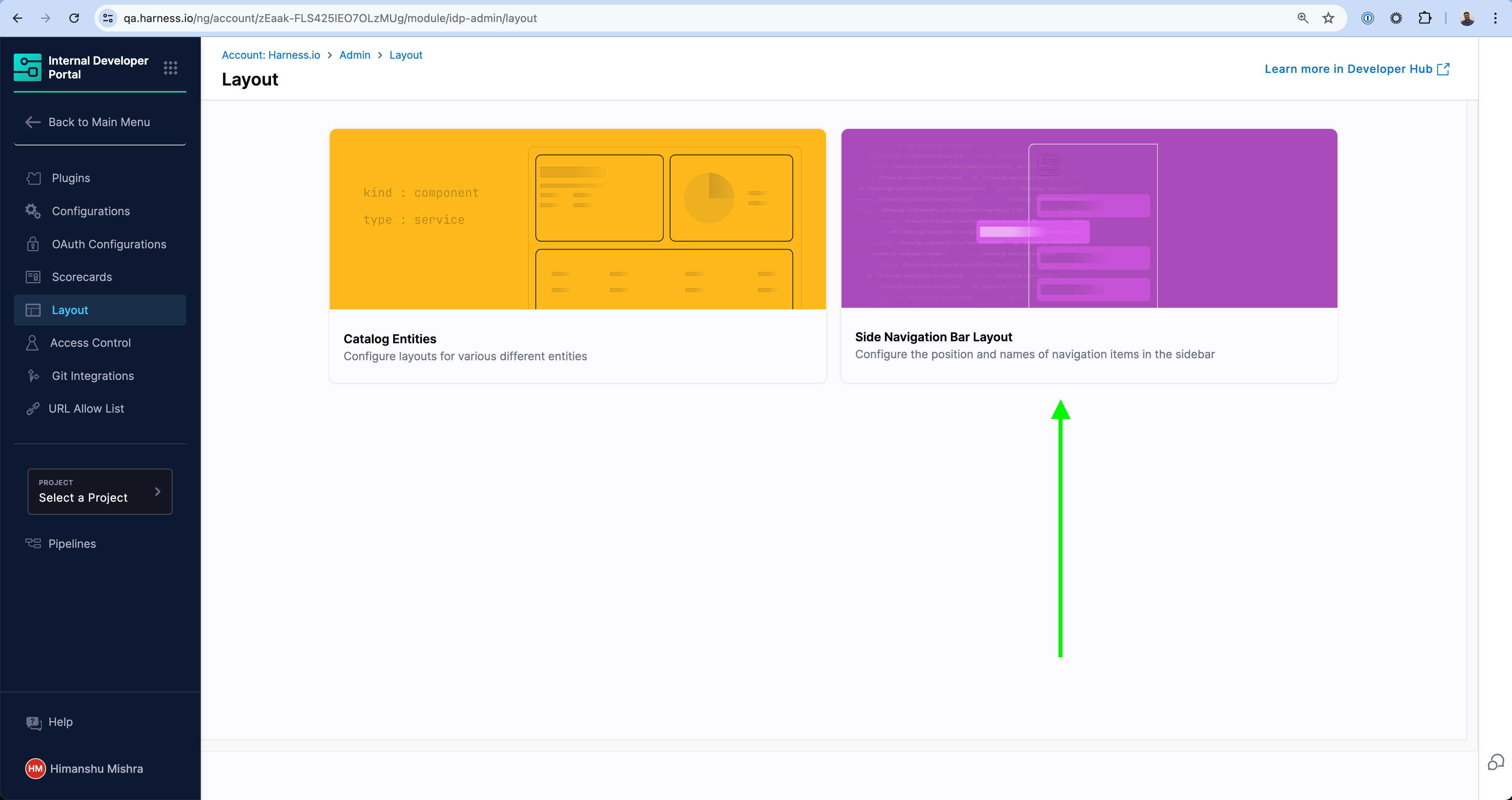 You can access the Sidenav Layout editor by navigating to Harness IDP and choosing Admin from the sidebar.