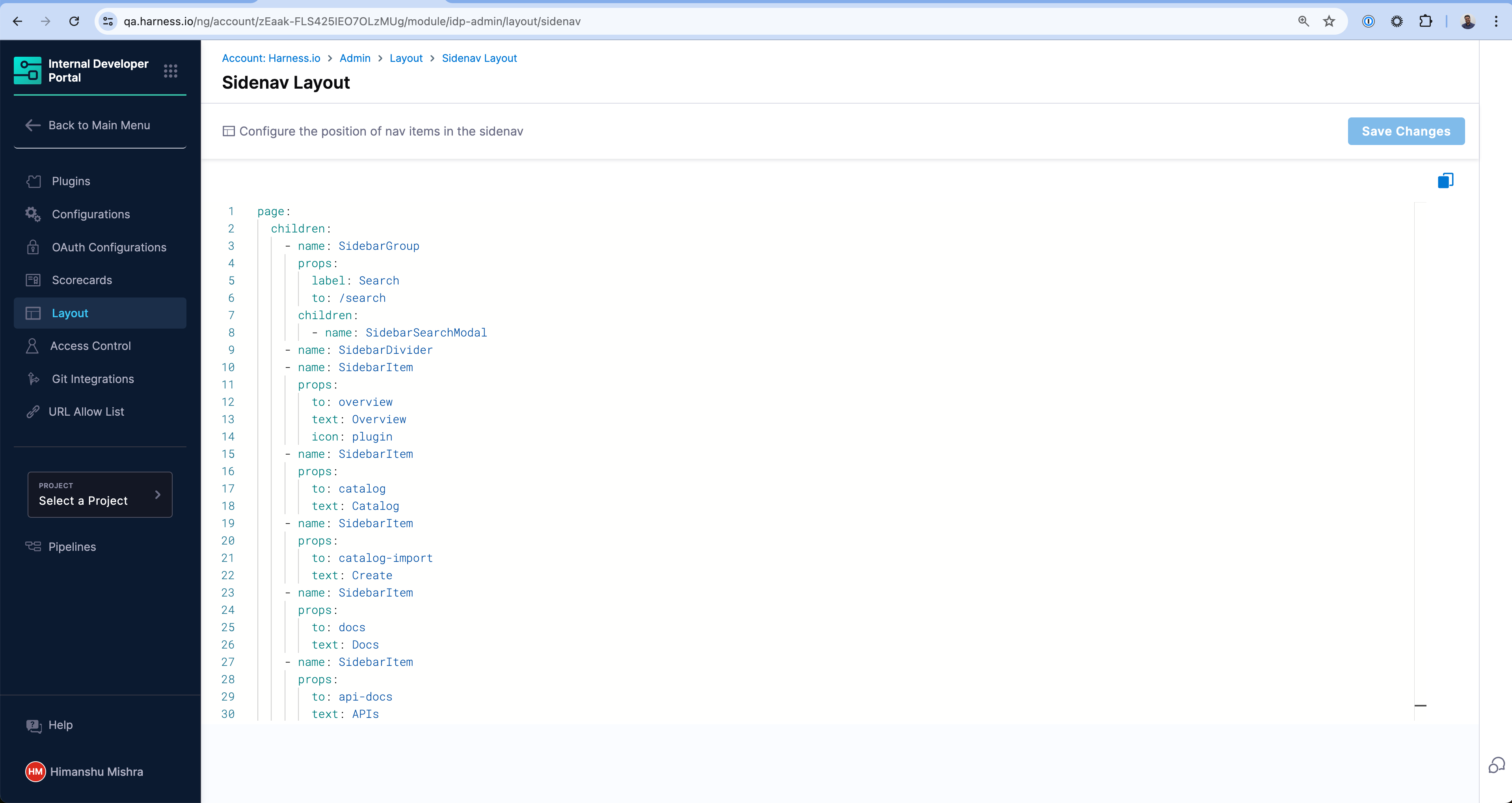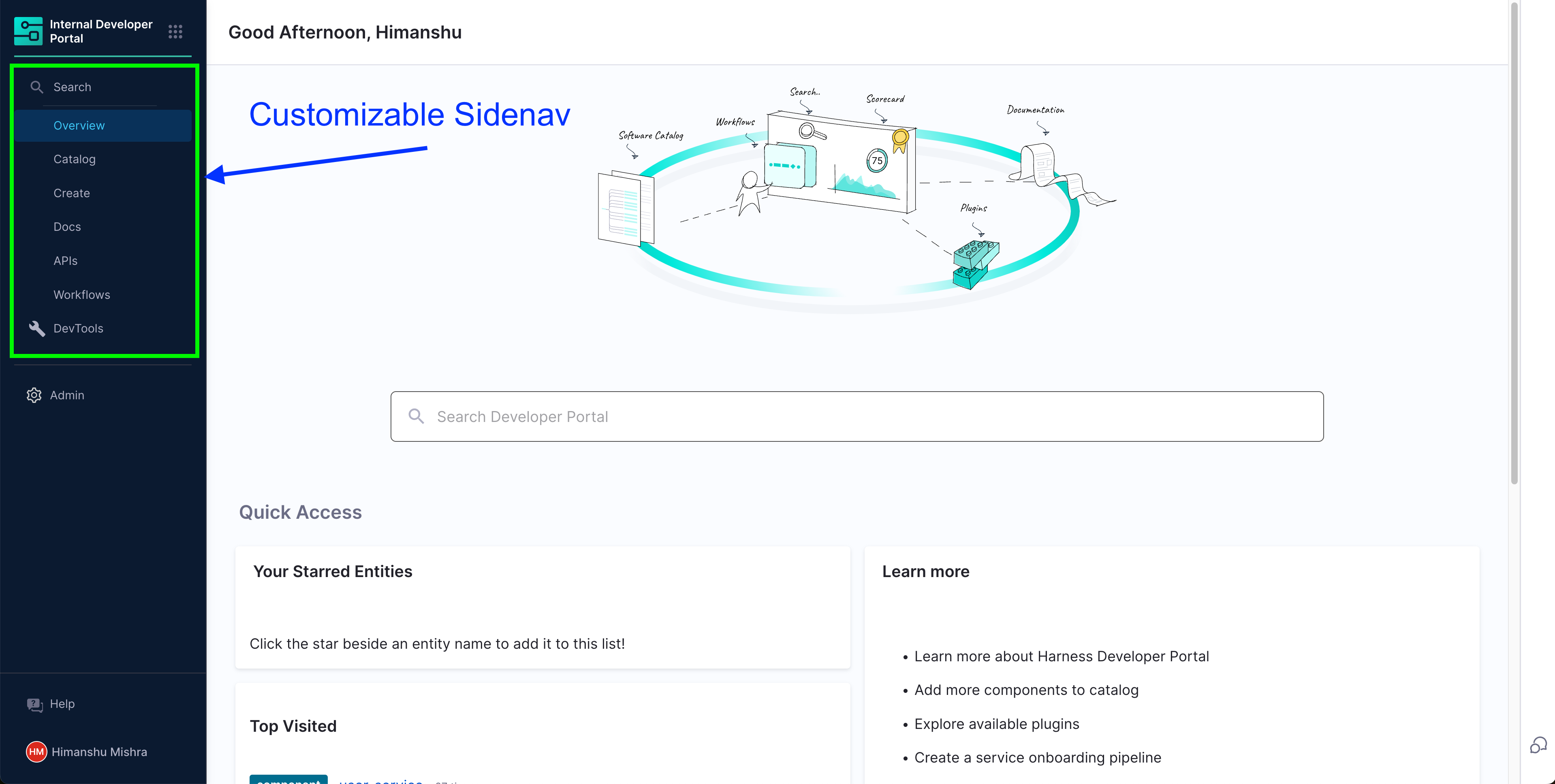 In Harness IDP, you as a platform admin can customize the sidebar navigation to ensure the end-users see what's important for them. This can be used to add new plugins, reorder existing items based on priority, add custom links to different tools for quick access, etc. The Sidenav changes are reflected for everyone using Harness IDP and does not affect any other Harness modules.