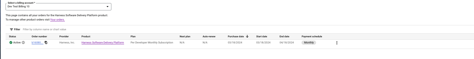 5. Navigate to Marketplace and go to the Orders section. Initially, your order is in a pending state while the Harness system approves and activates your account. The activation can take several minutes.