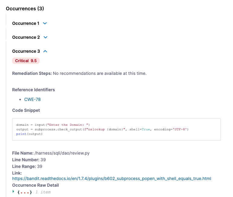 2. Examine the Occurrences list for this issue. (You might need to scroll down in the pane.) Here you can find additional details about each individual occurrence of the issue. Note that, to eliminate this vulnerability from the repo, you need to fix multiple occurrences: