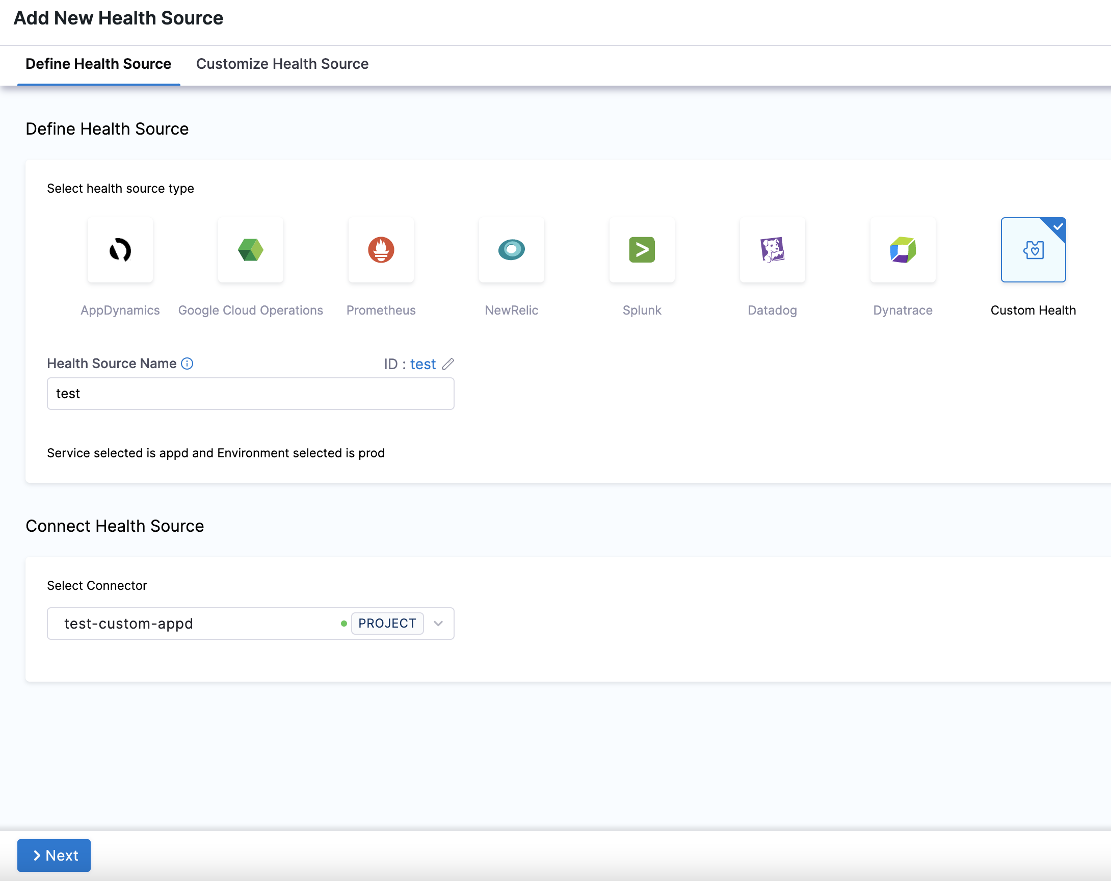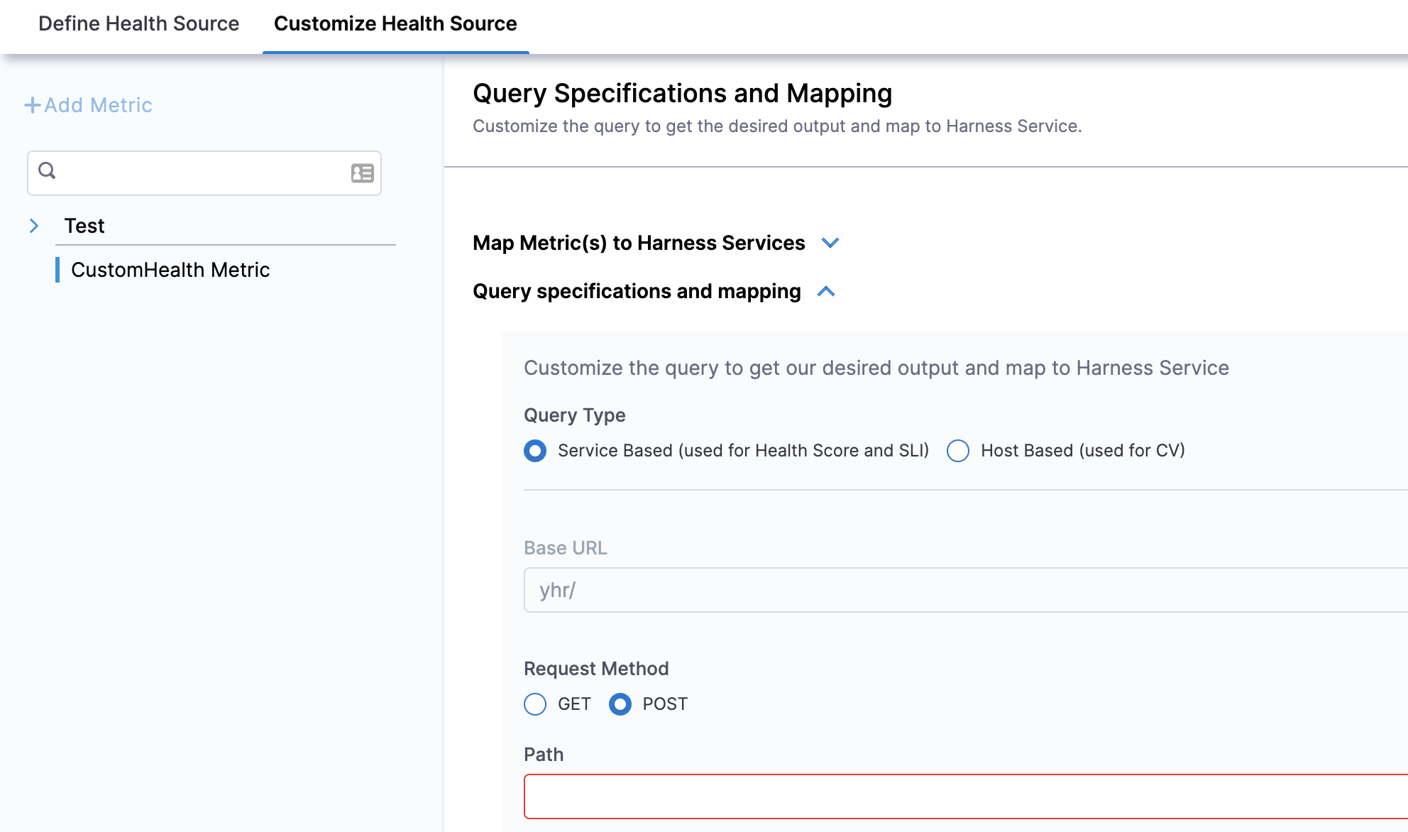 - If you select Custom Health Metrics, the Customize Health Source settings appear as:
