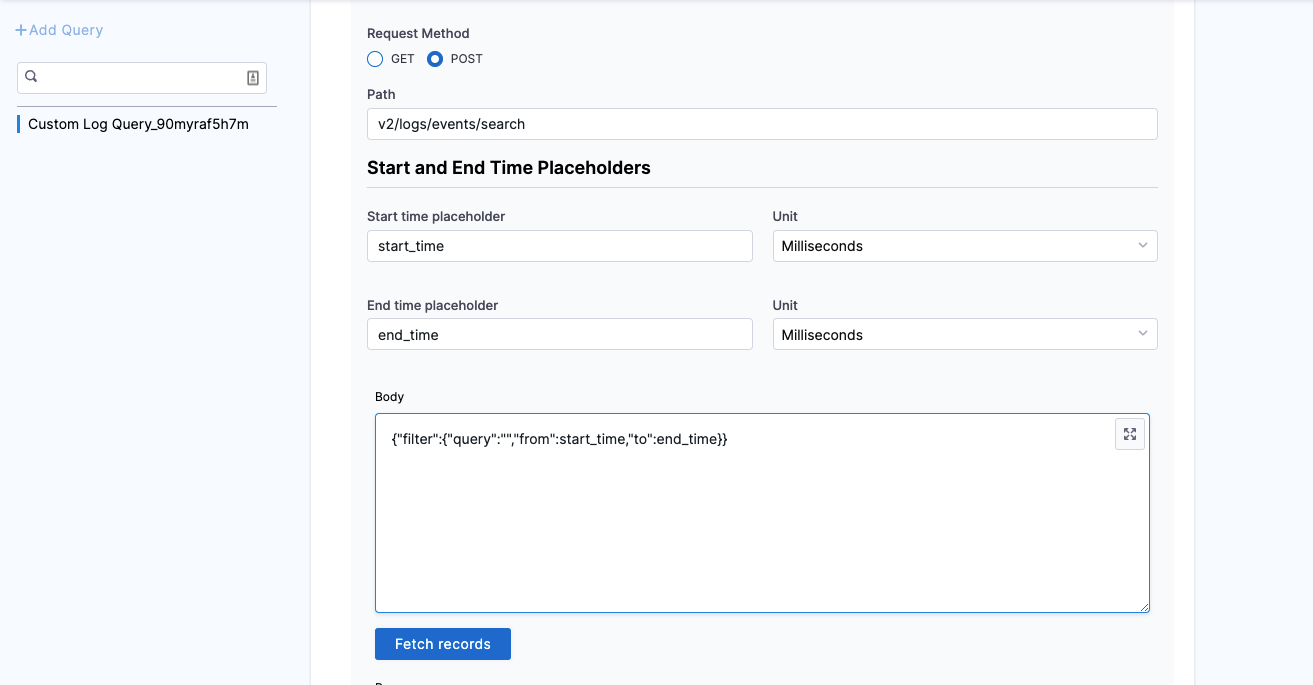 - In End time placeholder, enter the end time placeholder in the metric path. For example, end_time.