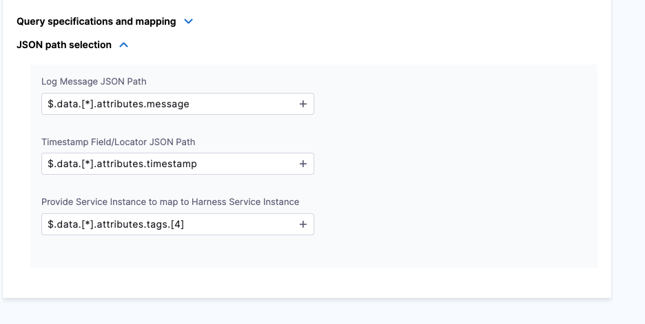 . - In Timestamp Field/Locator JSON Path, click the plus icon to select the path to the log message from the data source. For example,