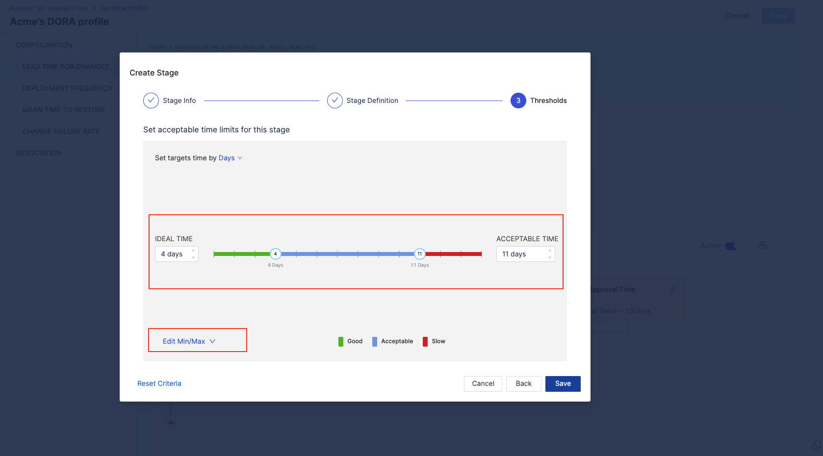 - Review the pre populated Stages that represent the PR lifecycle, from PR creation to merge. You can edit, add, and remove stages as needed. You can edit the data or fields that drive each stage, set time range goals, and more.
