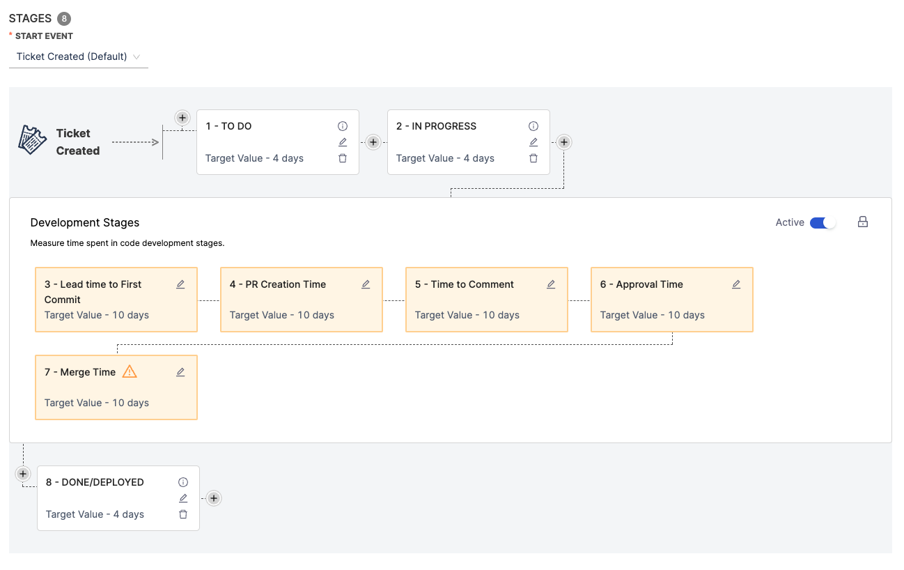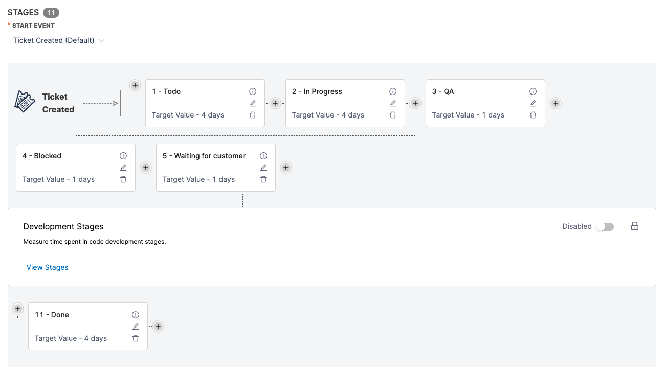 - To track progress in your issue management tool, select the + icon to add stages before and after the Development Stages. This allows you to track progress in both your issue management and SCM tools, from issue creation through code deployment.
