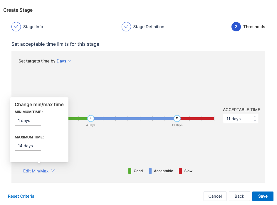 - Set acceptable time ranges for the stage, such as Ideal Time and Acceptable Time.