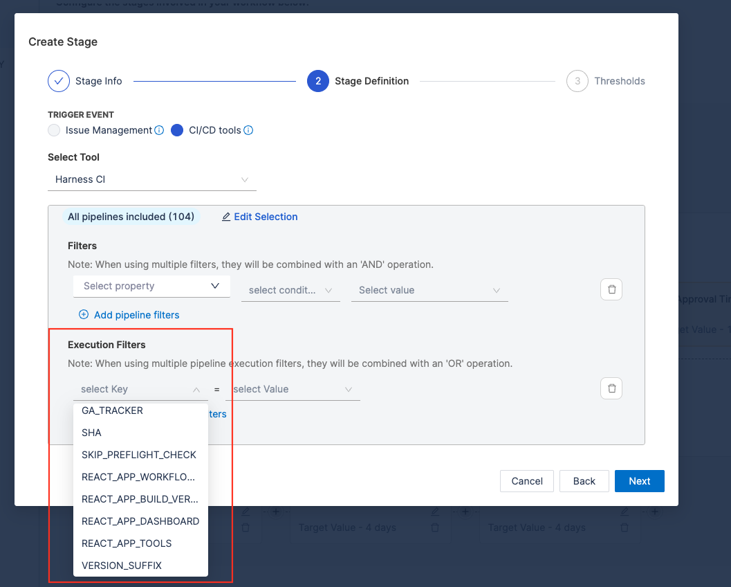 Use Filters to refine which executions are included in the stage. Filters refine which executions are included, leveraging pipeline properties from Harness CD configurations: